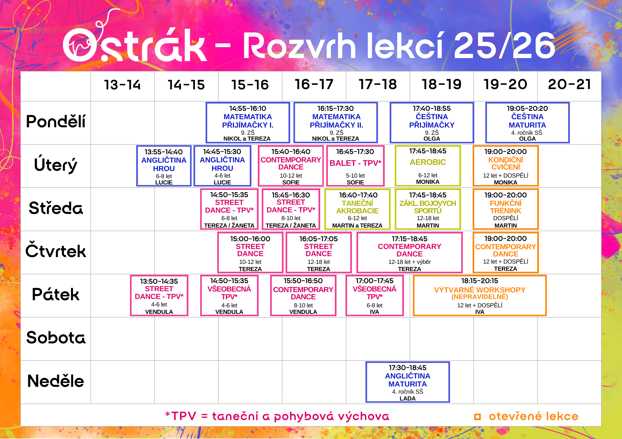 Spousta našich členů plynule přechází z Taneční skupiny TF, jejíž dvouleté fungování vyvrcholilo divadelním představením v červnu 2025. Na úspěchy navazuje Volnočasové centrum Čáslav – Ostrák, které nabízí nejen taneční a pohybové aktivity, ale nově i vzdělávací kurzy a různorodé workshopy.